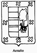 Este apellido vasco es una variante de 2) Casa solar: En el lugar de Arraño es un barrio del municipio de Lemona, partido judicial de Durango, Bizkaia, situado al pie del monte de su nombre, a dos kilómetros de Arraibi. En 1960 tenía 143 habitantes y 31 viviendas. Parece que el apellido de nuestros antepasados era "Arandia", pero vivían en "Arraño" y por eso les decían indistintamente "Juan de Arraño Arandia" o "Juan Arandia de Arraño". 3) Armas: Partido: primero, de azur, con tres fajas de oro, y segundo, de plata, con una encina de sinople, y un lobo de sable, armado de gules, pasante al pie del tronco. Bordura de gules con ocho sotueres de oro. 4) Antepasados: (ver árbol genealógico) I. Juan Díaz de Arraño (9° abuelo de Cándido Madaleno Gasteasoro) nació en Lemona, Bizkaia, hacia el año de 1520. Desconocemos el nombre de su mujer. Juan de Arandia de Arraño murió en Lemoa el 2-XII-1573. Tuvieron por hija a II. Mari Íñiguez de Arraño Arandia (8ª abuela) nació en Lemona hacia el año de 1550. Casó en Lemona con Juan Pérez de Ibarra, natural de Muxica, Bizkaia, el 10-I-1571 (ver Ibarra). Tuvieron por hijos a Juan (8-II-1575), Domingo (6-I-1578), Martín (26-III-1583) y Marina (24-III-1591). Nuestra familia desciende de Martín, que casó con Catalina de Urizar, en Lemona, el 3-IX-1613. 5) Ruta genealógica: Arraño® Ibarra ® Mendieta ® Alcibar ® Gasteasoro ® Madaleno.