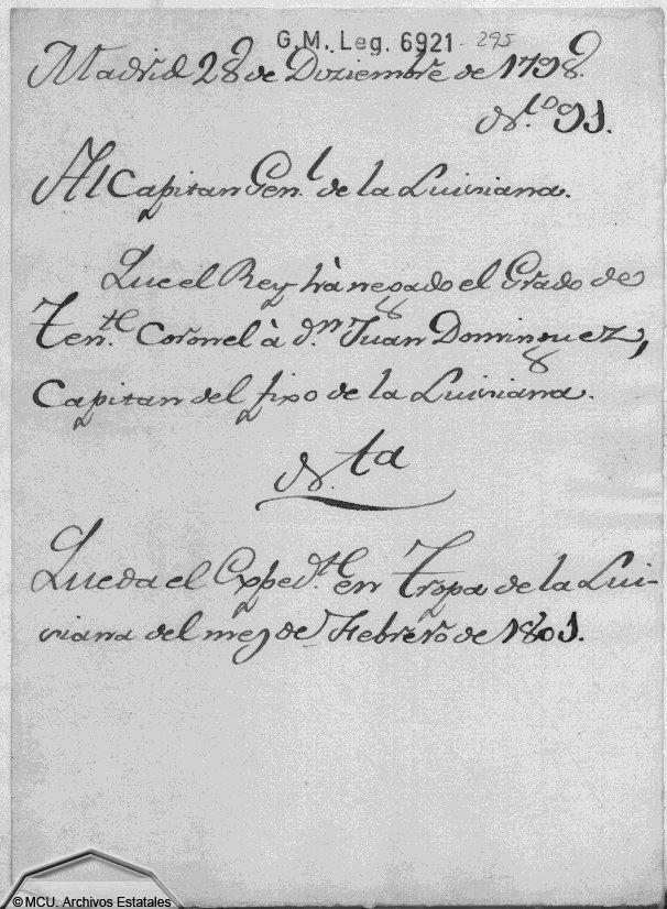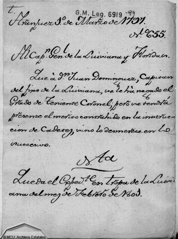 Don Juan Domínguez permanece en Panzacola como oficial de la guarnición de esa plaza. Por sus méritos en la instrucción de los cadetes del Regimiento Fijo de Infantería de la Luisiana, se solicita sus ascenso a Teniente Coronel en 1797. Desconocemos porqué el Carlos III no concedió ese ascenso, pero se conserva testimonio de esa documentación en el Archivo de Simancas. (cfr. docuimentos digitalizados: y ).