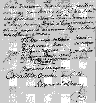 HISTORIA DE DON BERNARDO DE OTERO (c.1725 - 1784) Don Bernardo de Otero, nació hacia el año de 1725 en Portonovo, Pontevedra, una pequeña aldea situada en las rías bajas de Galicia. Es probable que su familia haya sido una de las principales de aquella zona del noroeste de España, pues tuvo la posibilidad de estudiar y prepararse para ocupar un cargo en la No hemos podido averiguar quiénes fueron sus padres. Es posible que sus nombres estén en su testamento, hecho el año de 1784, en Nueva Orleans. Lo que sí sabemos es que, desde las húmedas tierras gallegas pasó a Castilla y luego Andalucía. La primera noticia que tenemos de él es a través de la partida de bautismo de su segunda hija, María Gertrudis, que nació en Puerto Real, Cádiz, el 21-VIII-1759. Este dato nos indica que debió celebrar su matrimonio con doña Antonia Roso, por lo menos dos años antes, pues antes de María Gertrudis había nacido su hija Inés. El apellido de su mujer, "Roso" o "Rozo", es de origen genovés. Es probable que la familia Otero haya permanecido en la Villa de Puerto Real, donde estaba el Real Arsenal de la Armada, desde 1757 hasta 1774, año en que pasan a América. Antes de 1774, don Bernardo desempeñaba el cargo de "Maestro de Jarcias de la Armada", es decir, era el encargado de los aparejos y cabos de los buques de la Armada española, en el Real Arsenal de Puerto Real. Se trataba de un cargo administrativo en el que se manejaban grandes cantidades de dinero e implicaba una fundión de responsabildad y confianza. Don Bernardo de Otero estaba al tanto de todos los españoles que pasaban a ultramar con provisiones y diferentes cargos en la administración pública y en el Ejército de América. Seguramente alentaba en su espíritu la idea de ir también él a aquellas tierras lejanas de las Indias. No desaprovecho, por tanto, la oportunidad cuando la Corona de Castilla le ofrece una provisión para Amércia. El 30 de agosto de 1774 recibe el nombramiento de "Thesorero Oficial Real de las Caxas de la Provincia de Luysiana" (cfr. Archivo de Indias, Audiencia de Santo Domingo, Títulos Varios entre 1613 y 1818: Florida: 1773-1804). Sustituía a Martín Navarro que, el 18 de junio de ese año, había sido promovido al oficio de Contador General. El 17 de octubre de 1774 el Ministro de Indias da orden a la Casa de Contratación para que se permita que don Bernardo y su familia se embarque en la primera ocasión que se proporcione Navío del Rey o Mercante. Aunque en este documento de la Casa de Contratación (cfr. Archivo de Indias) se menciona que con la familia van dos criados, al parecer, sólo se embarcó uno de ellos: Francisco José Magaro, criado, natural de Puerto Real, hijo de Diego Magaro y de Baltasara Sánchez. No tardaría mucho la familia Otero en hacerse a la mar y, probablemente a finales de ese mismo año de 1774 habrán llegado a la Habana, destino del "Nombres de Jesús, María y José". Luego habrán embarcado en otro navío hasta su destino final: Nueva Orleans. Don Bernardo se instaló en Nueva Orleans y tomó posesion de su oficio. Durante casi seis años lo desempeño con competencia y en circunstancias difíciles, como fueron las que vivió durante la guerra contra los ingleses, por la que España recuperó territorios en la Luisiana y la Florida. A consecuencia de sus servicios, el Rey lo nombró Contador General del Ejército y Real Hacienda en la Provincia de la Luisiana. Copio parte del documento, fechado en Aranjuez el 3 de junio de 1781. La posesión del cargo tuvo lugar en Nueva Orleans el 20 de octubre de 1781: