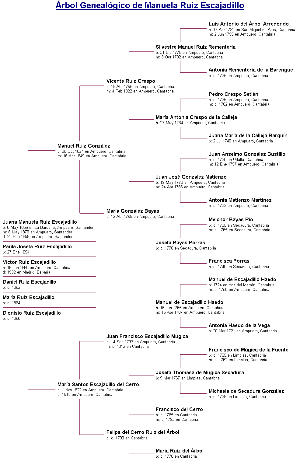 Ruiz Escajadillo (1856-1898) nació, en Sus padres fueron Manuel Ruiz González (Ampuero, 30-X-1824; ver linaje Ruiz) y María Santos Escajadillo del Cerro (Ampuero, 1-XI-1822; ver linaje Escajadillo), que casaron en Ampuero el 16 de abril de 1849. Procedía de la antigua familia pasiega de los Ruiz del Árbol que, desde Espinosa de los Monteros (Burgos), se habían trasladado a Cantabria a fines del siglo XVII: primero a San Miguel de Aras (Junta de Voto) y luego a La Bárcena (Ampuero). Por parte de su madre venía de los Escajadillo, preclaro linaje Cántabro que tuvo su casa solar en Hoz de Marrón (Ampuero), a pocos cientos de metros del Santuario de Nuestra Señora Bien Aparecida, patrona de Cantabria (ver árbol genealógico). Ver también sus apellidos y linajes. El 8 de mayo de 1876, a los veinte años de edad recién cumplidos, casó en Ampuero con Leandro Cano Gracia (1840-1896) (ver partida de matrimonio), entonces Teniente de Infantería, con quien tuvo cinco hijos: Francisco, Víctor, Julia, Araceli y Ángel (ver descendencia). Manuela murió en Ampuero el 22 de enero e 1898, muy joven: a los cuarenta y un años de edad. Dos años antes —en 1896, después de la muerte de su marido aquel año—, había enviado a sus dos hijos mayores, Francisco y Víctor, a México, para que trabajaran con sus hermanos Víctor, Daniel y Dámaso, que ya llevaban varios años residiendo en América, y tenían negocios en la Ciudad de México y en Torreón (Coahuila). Víctor Cano Ruiz es nuestro abuelo materno. __________________________________ |