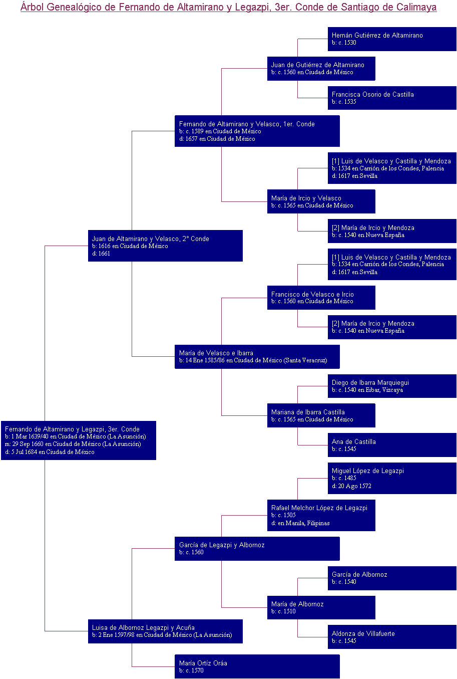 de Pardiñas (Castilla). I. Fernando Gutiérrez de Altamirano (c.1405), fue natural de Villa de Pardiñas, Castilla. Tuvo por hijo a II. Juan Gutiérrez de Altamirano (c.1435), natural de la Villa de Pardiñas. Tuvo por hijo a III. Hernán Gutiérrez de Altamirano (c.1465), alcalde de Arenas (lugar cercano a Talavera) y capitán de cien lanzas que tenía en Arévalo y Ontiveros, casó en la Villa de Pardiñas con doña Teresa Carrillo. Tuvieron por hijo a IV. Juan Gutiérrez de Altamirano (c.1490), hidalgo de Medellín, casó con Juana de Pizarro Altamirano (prima hermana de Hernán Cortés). Probablemente pasó a Santo Domingo hacia 1504 y a Tierra Firme diez años después. El 17 de febrero de 1531 se le hizo merced, en la Ciudad de México, de un solar donde construyó su casa, que más tarde fue ocupado por sus descendientes, los condes de Santiago de Calimaya, cuya casa-palacio aún existe en la esquina de las actuales calles de Pino Suárez y El Salvador. Fue padre de 1°) Hernán (c.1530, que sigue) y 2°) Juan Alonso (c.1532, ver nota 1). V. Hernán Gutiérrez de Altamirano (c.1530), casó con Francisca Osorio de Castilla, hija de Luis de Castilla y Juana de Sosa (ver nota 2), y fueron padres de: 1°) Juan (c.1560, que sigue), 2ª) Sebastiana (c.1570, ver nota 3) y 3°) Pedro (c.1580, ver nota 4). VI. Juan Gutiérrez de Altamirano (c.1560), casó con María de Ircio y Velasco (ver árbol genealógico; hija del virrey de la Nueva España don Luis de Velasco y Castilla y Mendoza (1534-1617), y de María de ircio y Mendoza). Fueron padres de VII. Fernando de Altamirano y Velasco (c.1589-1657), casó con María de Velasco e Ibarra (ver nota 5). En 1616 recibió el título de 1er. Conde de Santiago de Calimaya. Fueron padres de 1ª) Luisa (b: en la Catedral de México, el 8-IX-1608), 2ª) María (b: 9-VIII-1612) y Juan (1616, que sigue). VI. Juan de Altamirano y Velasco (1616-1661). Caballero de Santiago en 1625 y segundo Conde de Santiago de Calimaya. Casó con Luisa de Albornoz Legazpi y Acuña (ver nota 6). Fueron padres de VII. Fernando de Altamirano y Legazpi (1640-1684; ver árbol genealógico), tercer Conde de Santiago. Bautizado en la Catedral de México el 1-III-1639/40. Murió el 5-VII-1684. Caso el 29-IX-1660, en la Catedral de México, con María Isabel de Villegas y Castilla (ver nota 7 y árbol genealógico). Fueron padres de 1°) Juan (1669, 4° Conde, casado con Teresa Hurtado de Mendoza, y padre del 5° Conde, Fernando Altamirano y Mendoza, que murió de niño) y 2°) Nicolás (1677, 6° Conde, que sigue). VIII.