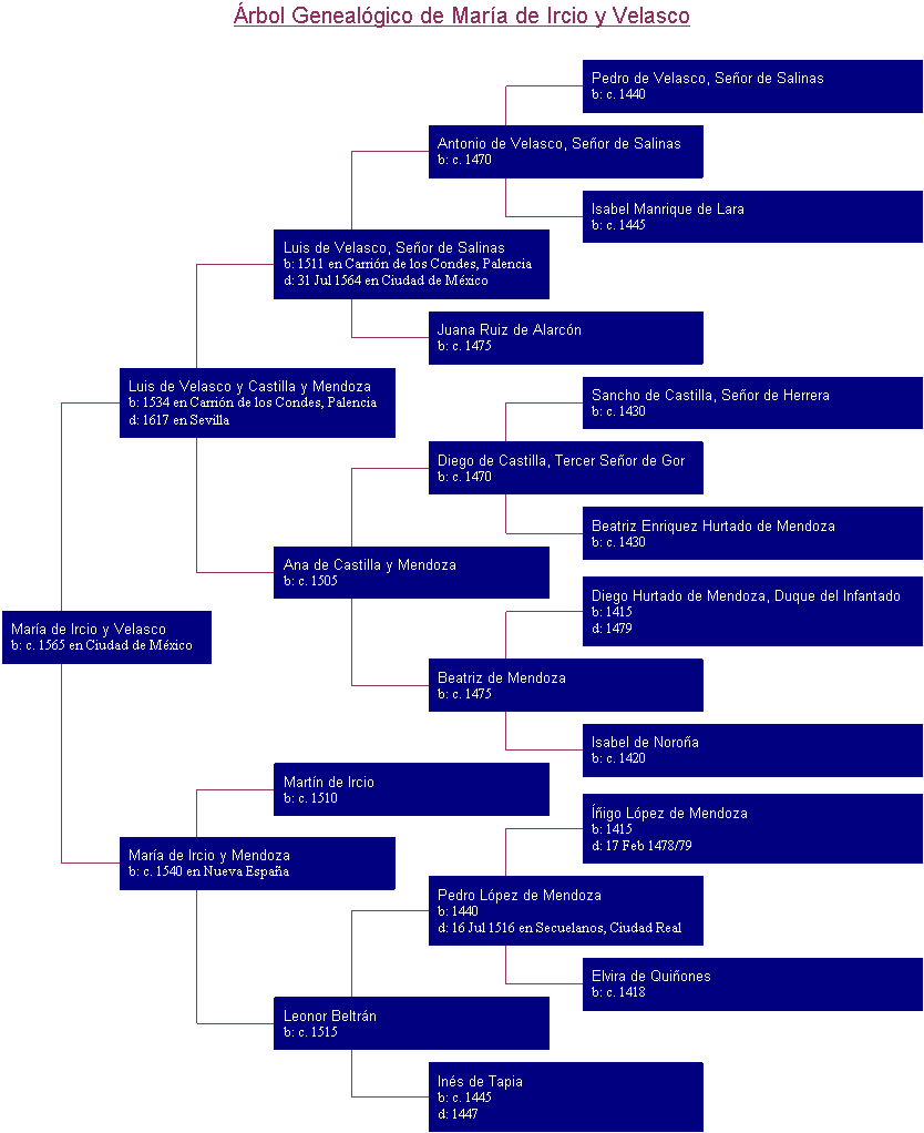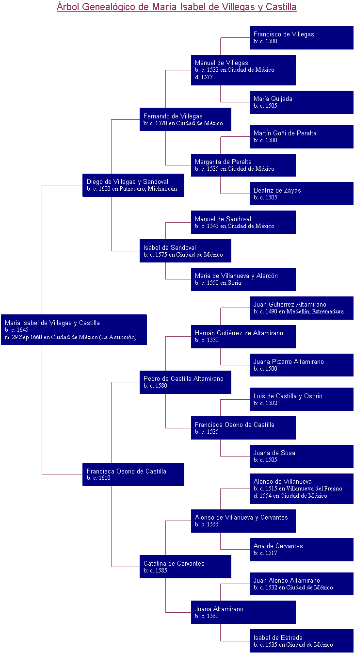 (1675-1621, 6° Conde de Santiago de Calimaya). IX. Juan Javier Joaquín de Altamirano y Gorráez (1710, 7° Conde de Santiago). El 21-VI-1732 casó, en la Catedral de México, con doña Ana Urrutia de Vergara Alfonso (1715-1739, ver nota 9). Fueron padres de X. Juan Lorenzo de Altamirano y Urrutia (1733-1793, 8° Conde de Santiago). Nació en la Ciudad de México en 1733. Casó con doña Bárbara de Ovando y Rivadeneira (ver nota 10). Murió en 1793. Fueron padres de 1ª) María Isabel (1763, 10a. Condesa) y 2ª) Ana (1766, 11a. Condesa, que sigue). XI. Doña Ana de Altamirano de y Ovando (1766), que nació el 29-VII-1766 en la Ciudad de México. Casó con Ignacio Leonel Gómez de Cervantes y Padilla (ver Cervantes), el 29 de abril de 1784. Al haber fallecido todos los miembros de la familia Altamirano, en 1802, doña Ana entró en posesión de los bienes y títulos de esta familia. Murió en 1809. El hijo mayor de don Ignacio y doña Ana, 1°) José María Cervantes y Altamirano, heredó el condado de Santiago de Calimaya y el marquesado de Salinas. Casó con Mariana de Michaus (1787-1811) en 1809 y tuvieron por hijo a José Juan Gómez de Cervantes y Michaus (1810-1874). Dos hijos más de don Ignacio y doña Ana fueron Miguel (casado con Joaquina Estanillo) y Rafael (casado con Manuela Ozta y Cotera). ------------------------------------------------------- NOTAS: [1] Juana Alonso de Altamirano (c.1535) casó con Isabel de Estrada, hija de Jorge de Alvarado y doña Luisa de Estrada y nieta de don Alonso de Estrada y Marina Gutiérrez Flores de la Cavallería (que era hermana de Diego Gutiérrez de la Cavallería: ver este linaje). Una tataranieta de Juan Alonso de Altamirano e Isabel de Estrada, llamada María Isabel de Villegas, caso en 1660 con Fernando de Altamirano y Legazapi (ver arriba: Tercer Conde de Santiago de Calimaya). [2] Francisca Osorio de Castilla (c.1535), era hija de Luis de Castilla y Osorio (c.1502), y Juana de Sosa (hija de Lope de Sosa, gobernador y capitán general de las Islas Canarias, y de doña Inés de Cabrera, hermana del tesorero de la Real Hacienda en la Nueva España, don Juan Alonso de Sosa). Su padre, Luis de Castilla y Osorio (ver árbol genealógico), era tataranieto del Infante de Castilla, don Juan, hijo del Rey Pedro I, el Justiciero, y de doña Juan de Castro Ponce de León, que está enterrado junto a su padre, Pedro I, en el convento de Santo Domingo el Real, de Madrid, en un sepulcro de marmol negro. En el epitafio de don Juan se lee: "Aquí yace el muy excelente Señor D. Juan, hijo del muy alto Rey D. Pedro, cuyas animas nuestro Señor aya y de tres hijos suyos. Su vida y fin fue en prisiones de la ciudad de Soria. Fue mandado enterrar por el Rey D. Enrique en San Pedro de la misma ciudad, y de allí trasladados sus huesos Viernes a veinte y cuatro de Diciembre de mil quatrocientos quarenta y dos aquí en esta sepultura. Sor Doña Constanza su hija, Priora del dicho Monasterio de Santo Domingo el Real, cuya anima aya Nuestro Señor. Los que me mirais, conoced el poder grande de Dios; El me hizo nacer de muy alto rey; mi vida y fin fue en prisiones sin merecerlo. Toda la gloria de este mundo es nada. La bienaventuranza cumplida es amar y temer a Dios". Es especialmente interesante el árbol genealógico de doña Juana de Zúñiga y Portugal, abuela paterna de Luis de Castilla, porque entronca en pocas generaciones con los reyes de Castilla, Navarra, Portugal y Francia. [3]